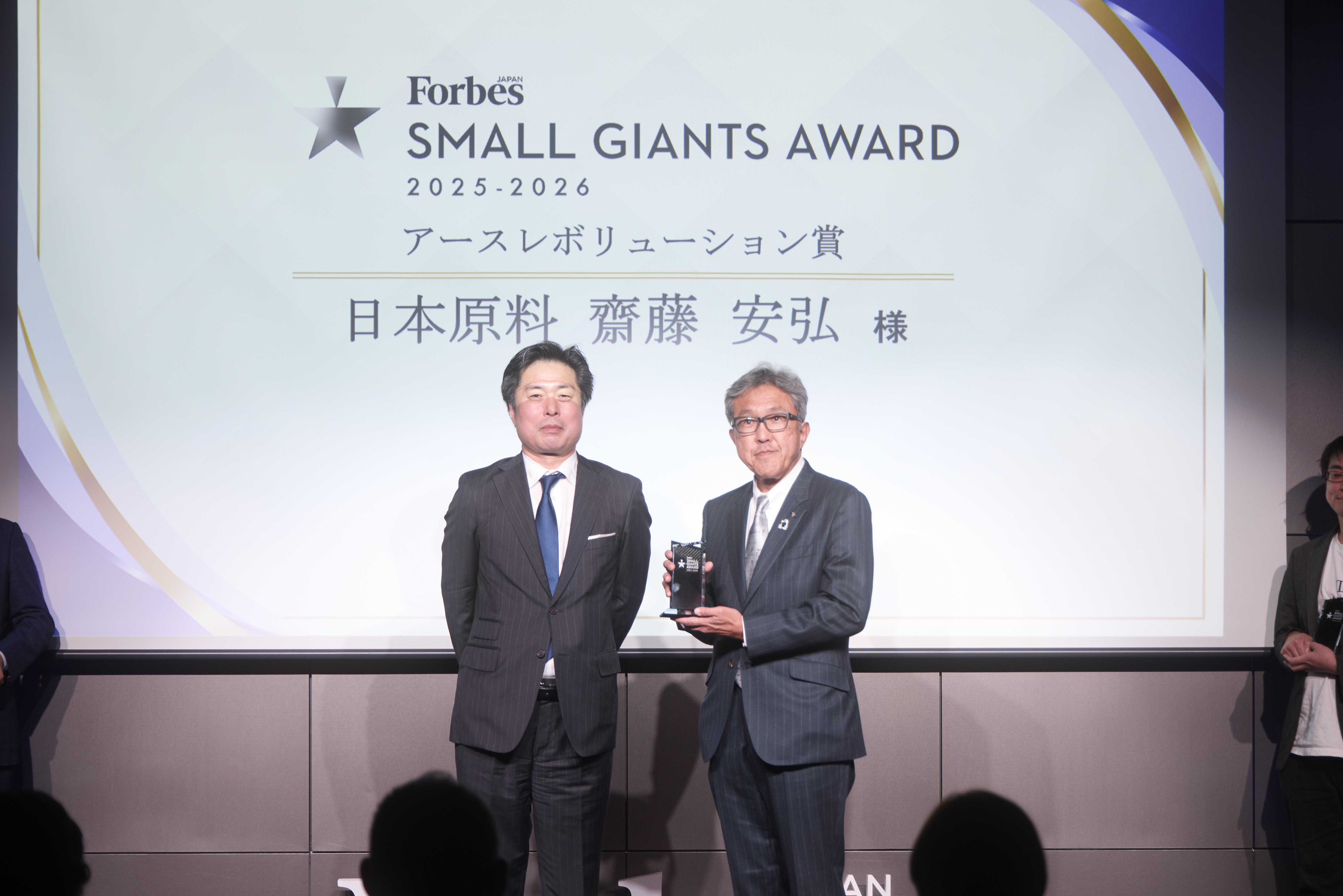 2025年11月26日、Forbes JAPANが主催の、規模は小さくとも高い技術力や可能性を持つ企業の発掘を目的とした「スモール・ジャイアンツ 」プロジェクトにおいて、全国166社の中からファイナリスト7社に選出いただき、『アースレボリューション賞』を受賞いたしました。